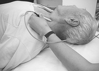 顱外頸動(dòng)脈的檢測(cè)部位位于頸部,均為皮膚及軟組織,因此正常情況下檢出率接近100%。探頭置于胸鎖乳突肌內(nèi)側(cè)緣或輕壓于胸鎖乳突肌上是檢測(cè)頸總動(dòng)脈(CCA)的部位,通常可以感覺(jué)到CCA明顯的搏動(dòng);探頭沿頸部向上移動(dòng)抵在下頜角下的部位(下頜下窗)(見下圖),此部位是檢測(cè)ICA顱外段(extracranial internal carotid artery,EICA)和頸外動(dòng)脈(ECA)的部位。探頭朝下置于鎖骨上窩,可獲得鎖骨下動(dòng)脈(SubA)和椎動(dòng)脈(VA)起始部的血流信號(hào),但由于走行變異較大,VA起始部的檢測(cè)往往較為困難,易造成漏診。此外,在耳屏后下方,即骨性標(biāo)志乳突下1cm左右還可以檢測(cè)到VA環(huán)樞段血流信號(hào)。