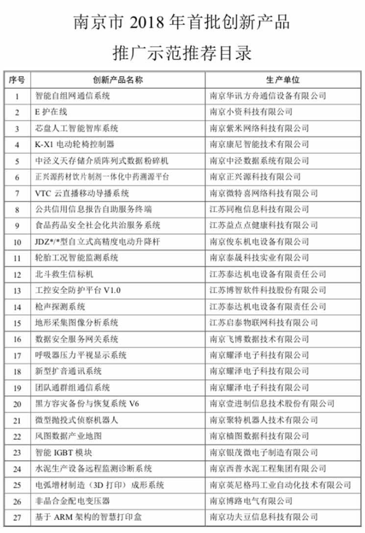 市政府關于印發(fā)南京市2018年首批創(chuàng)新產(chǎn)品推廣示范推薦目錄的通知