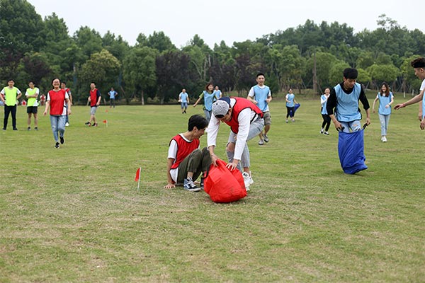 第二個(gè)比賽是四人五足,顧名思義就是每組派出4名隊(duì)員參加,用游戲道具將4個(gè)人的腿兩兩綁在一起,四人并行,先到終點(diǎn)的隊(duì)伍獲勝,這個(gè)游戲考驗(yàn)的就是每組隊(duì)員配合的默契性,不是一個(gè)人跑的快就可以,一定要和大家步調(diào)一致才行。一二一二、一二一二紅隊(duì)的四個(gè)隊(duì)員邁著整齊的步伐,喊著響亮的口后,雖然一開始他們并不是最快的,但是他們一直跟隨著自己的口號節(jié)奏,逐步趕上前面的隊(duì)伍,有的隊(duì)伍一開始很快,但是缺乏口令,走著走著步調(diào)就不一致,有的隊(duì)伍中的隊(duì)員自己很著急,步子邁的很大,沒有顧及到其他隊(duì)員,導(dǎo)致摔倒或道具掉落,按照游戲規(guī)則要調(diào)整好了才能繼續(xù)比賽。最終紅隊(duì)獲勝。這個(gè)游戲就是告訴我們在工作中需要相互配合,才能完成任務(wù),很多事情不是你一個(gè)人就可以,個(gè)人英雄在企業(yè)里是不存在。